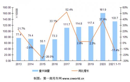 2013-2021年我国重卡市场销量年度走势图(单位:万辆)