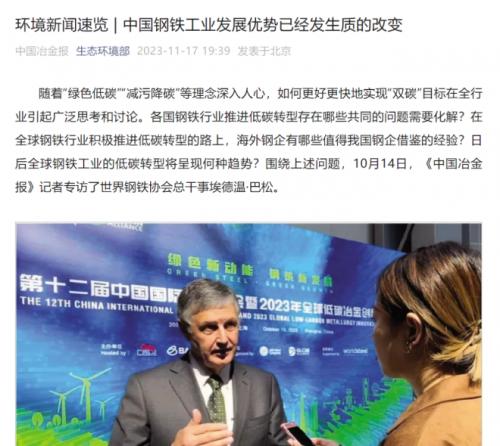 11月17日,生态环境部官微以《中国钢铁工业发展优势已经发生质的改变》为题,转载《中国冶金报》文章,关注中国钢铁工业的绿色低碳发展。