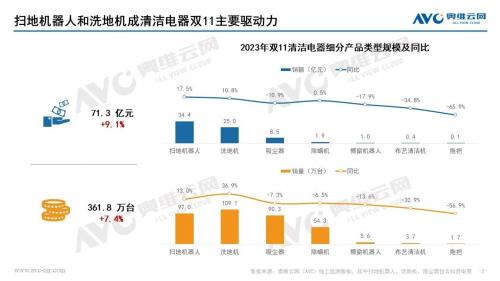 2023年双11促销期(10月23日-11月12日),清洁电器线上整体销额71.3亿元,同比增长9.1%,销量361.8万台,同比增长7.4%。总体来看,双11促销期成绩喜忧参半,喜的是宏观环境不乐观,消费需求放缓前提下,清洁电器整体实现了正向增长,忧的是增长主要靠扫地机器人品类支撑,而洗地机均价下探明显,导致增速不及预期,其余细分品类表现更是差强人意。回顾双11促销期,市场呈现以下几个特征: