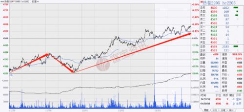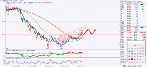 全国煤炭交易会12月3日公布了2022年煤炭长期合同签订履约方案征求意见稿。该意见稿由国家发改委制定,其中明确2022年的煤炭长协签订范围进一步扩大,核定能力在30万吨及以上的煤炭生产企业原则上均被纳入签订范围;需求一侧,要求发电供热企业除进口煤以外的用煤100%签订长协。价格方面,“基准价+浮动价”的定价机制不变,但意见提出,新一年的动力煤长协将每月一调。5500大卡动力煤调整区间在550-850元之间,其中下水煤长协基准价为700元/吨,较此前的535元上调约31%。二、产业信息◆“十三五”期间河北省规上工业企业单位工业增加值能耗下降26.08%;今年新增专项债发行临近尾声投向结构将优化;经济合作与发展组织:预计2022年全球GDP增速为4.5%;钢铁行业碳达峰实施方案已基本成型;刘鹤:预计全年经济增长将超过预期目标。三、市场行情回顾本周全国热卷市场涨跌稳均有,幅度在0-100元,截止发稿前,和上周五对比,有18个城市价格出现窄幅下跌,幅度最大的有乌鲁木齐、沈阳、柳州和沧州;有14个城市价格出现窄幅上涨,主要包括济南、长沙和杭州;有8个城市价格持平。从地区来看,东北地区涨跌幅度集中在10-60左右;具体来看:从上周五开始各地区现货跟随期货先弱后强运行,涨跌幅度收窄,大幅提振现货市场心态,商户挺价意愿较强,然高位成交不畅,整体低位成交较好;从宏观面来看,热卷期货市场情绪高涨,带动现货市场成交好转,近期随着轧钢厂复产,原料强于成材运行,而钢材现实情况同样表现为去库、缺规格、大基差,多头积蓄力量时间较长,钢材上涨,终端需求也较上周有所好转,但是现货价格涨跌幅度有限。截止今日较上周五天津跌10报4840元/吨;上海涨20报4770元/吨;乐从持平报4850元/吨。本周库存:本周热卷实际产量280.63万吨,较上周减少11.29万吨;钢厂内库存90.2万吨,较上周减少3.32万吨;社会库存237.09万吨,较上周减少0.21万吨。总库存327.29万吨,较上周减少3.53万吨;表观需求284.16万吨,较上周减少9.88万吨,本周热卷库存减仓力度加大。四、热卷期货走势及分析本周卷螺走势偏强,上周五晚间低开后,在周初形成双踩底部支撑位,与周二午盘开启本轮的强势反弹行情,期间波动虽有波折,但是总体结构保持不断的刷新高点,螺纹周四随有阴线断连阳,但是整体窄体阴线位于前阳实体上部,属于中继表现,后收光头阳线,以周线放量中阳收盘,总体上涨334个点,涨幅8.24%。热卷前期波动弱于螺纹,后以日线5连阳,形成中阳周线收盘,总体上涨354,涨幅7.69%。