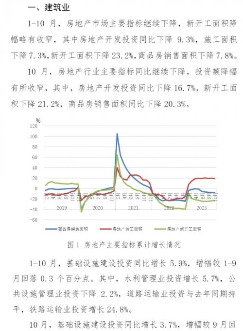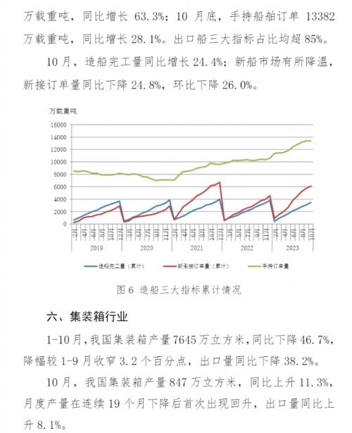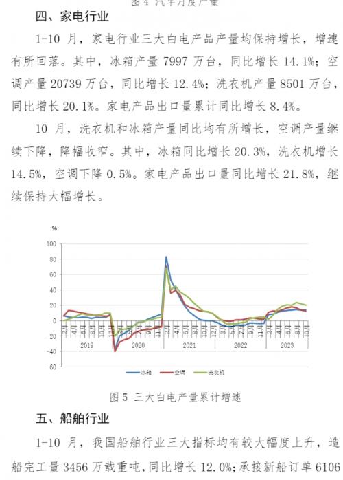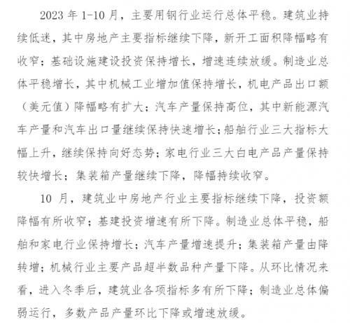 2023年1-10月,主要用钢行业运行总体平稳。建筑业持续低迷,其中房地产主要指标继续下降,新开工面积降幅略有收窄:基础设施建设投资保持增长,增速连续放缓。制造业总体平稳增长,其中机械工业增加值保持增长,机电产品出口额(美元值)降幅略有扩大;汽车产量保持高位,其中新能源汽车产量和汽车出口量继续保持快速增长;船舶行业三大指标大幅上升,继续保持向好态势;家电行业三大白电产品产量保持较快增长;集装箱产量继续下降,降幅持续收窄。