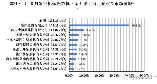 2021年1-10月农业机械内燃机(柴)销量前十企业排名出炉。