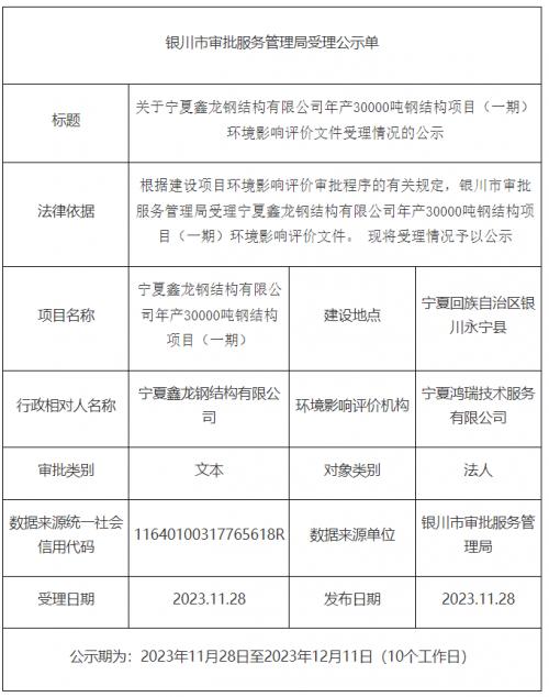 11月28日,宁夏鑫龙钢结构有限公司年产30000吨钢结构项目(一期)环评受理公示。
