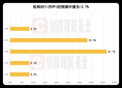 另一方面,11月PPI同比降幅或将小幅走扩,市场机构预测中值为-2.7%,最高、最低值分别为-2.4%、-2.9%。
