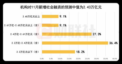 预测显示,11月新增社融有望同比多增,市场机构预测中值为2.43万亿元,去年同期社融规模增量为1.99万亿元。其中,超6成机构预测值落在2.2万亿至2.61万亿元区间。