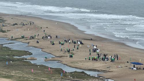 11月29日,中国宝武湛江钢铁组织部分党员、团员代表以主题党日、主题团日形式开展“净滩”志愿行动,对海滩垃圾进行大面积清理。活动现场,120余名志愿者身穿马甲,手拿垃圾袋、铲子等工具,一同捡拾垃圾,身体力行守护碧海银滩。志愿者们历时1个小时,合计清理出垃圾约2吨,并及时移交至景区管委会进行集中处理。图为活动现场。