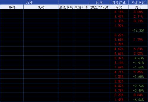 11月型钢价格涨跌互现。原料方面,部分调坯轧材企业陆续复产,叠加期货盘面回调,钢坯价格跟降,轧钢厂多逢低采坯。库存方面,社库去库速度放缓,长流程钢企厂内库存仍处于高位,去库压力仍存。需求方面,补库意向不强,下游钢构厂及机械加工厂对于高价资源接受能力有限。情绪方面,从冬储调研情况来看,贸易商冬储意向较去年同期相比变弱,随着价格拉涨,贸易商“恐高”情绪出现。