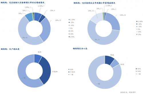 需求方面,根据我网调研的钢结构企业样本订单,临近年底,国家资金不断投入,市场经济环境稍有提振,但季节性影响因素尚存。12月份月环比新增订单增加的企业占比为10.11%,较11月预期环比新增订单下降11.24个百分点,市场整体情绪反馈一般,市场需求上升空间有限。西北地区订单反馈减量明显,西南、华中及华南表现一般,华东沿海地区市场建设积极性较高,调研预期12月份钢构企业生产饱和度表现一般。