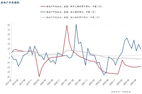 从房地产开发投资完成情况来看,1-10月份,全国房地产开发投资95922亿元,同比下降9.3%;1-10月份,房地产开发企业房屋施工面积822895万平方米,同比下降7.3%。其中,住宅施工面积579361万平方米,下降7.7%。房屋新开工面积79177万平方米,下降23.2%。其中,住宅新开工面积57659万平方米,下降23.6%。房屋竣工面积55151万平方米,增长19.0%。其中,住宅竣工面积40079万平方米,增长19.3%。市场房建投资仍处下行通道,住房存量待进一步消化,房地产销售表现不佳,新增投资投入减量。