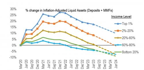 下图显示,到2024年6月,除收入最高的1%人群外,每个收入群体经通胀调整后的流动资产(以存款和货币市场基金的形式)都将低于2020年3月的水平。