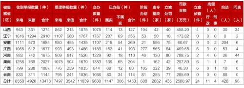 截至4月19日晚20:00,各督察组共收到群众来电、来信举报13478件,受理有效举报11039件,经梳理合并重复举报,累计向被督察单位转办9630件;被督察省份已完成查处1453件,其中立案处罚435家,罚款2580.97万元;立案侦查24件,拘留15人;约谈党政领导干部428人,问责党政领导干部96人。