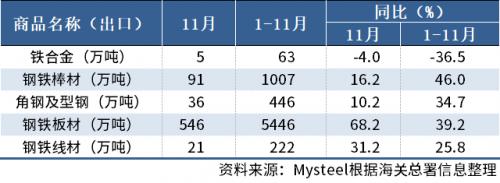 11月,中国出口钢铁棒材91万吨,同比增长16.2%;1-11月累计出口1007万吨,同比增长46.0%。其他出口情况如下表所示: