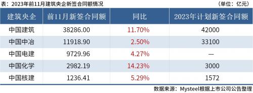 据Mysteel不完全统计,截至12月20日,共有5家建筑央企公布其1-11月新签合同额情况,合计新签合同额约64153.46亿元,较去年同期(59013.81亿元)增长8.71%。