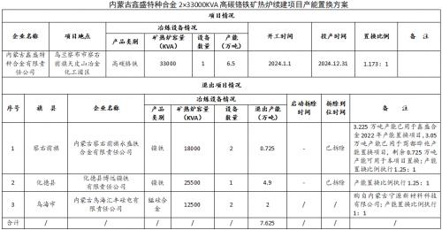 按照内蒙古自治区工信厅发改委生态环境厅能源局关于印发《内蒙古自治区促进铁合金产业高质量发展政策措施》的通知(内工信发〔2023〕134号)、内蒙古自治区发展改革委工信厅能源局关于修订《确保完成“十四五”能耗双控目标任务若干保障措施》的通知(内发改环资字〔2023〕1081号)、内蒙古自治区发展改革委生态环境厅工信厅能源局关于印发《内蒙古自治区坚决遏制“两高一低”项目盲目发展管控目录(2023年修订版)》的通知(内发改环资字〔2023〕1080号)和乌兰察布市工信局关于印发《乌兰察布市铁合金行业产能置换实施方案(试行)的通知》(乌工信发〔2022〕59号)的相关要求,现将内蒙古鑫盛特种合金有限责任公司2×33000KVA高碳铬铁矿热炉续建项目产能置换方案予以公示,公示期自公示之日起5个工作日。如有异议,可通过来访、来函、来电等形式向我局反映。