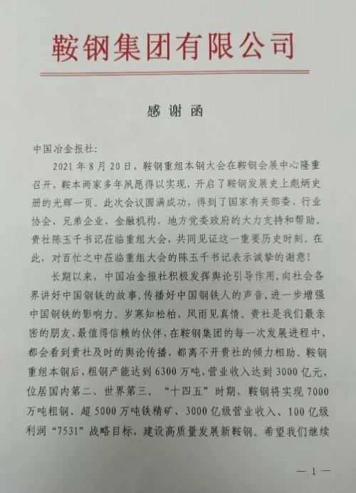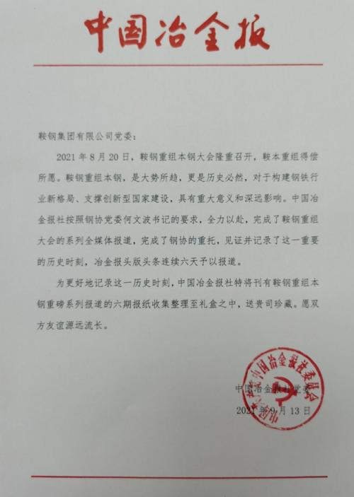 中国冶金报社按照何文波书记的要求,由社长带队,集中报社骨干力量,全力以赴,完成了鞍钢重组本钢大会的系列全媒体报道,见证并记录了这一重要的历史时刻。《中国冶金报》利用6期头版头条予以报道,先后刊发钢协会长副会长单位领导、下游主要用户领导的贺词贺信等报道25篇,后续报道6篇;中国冶金报社官微持续跟踪报道相关新闻,共发布报道42篇,反响热烈,网友纷纷留言讨论鞍钢重组本钢的重大意义。