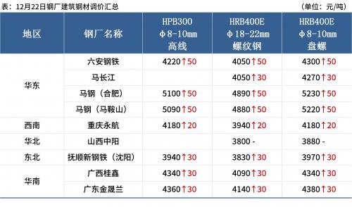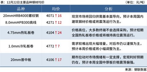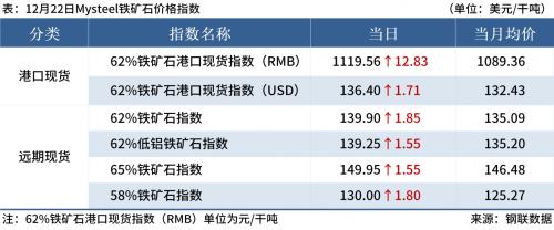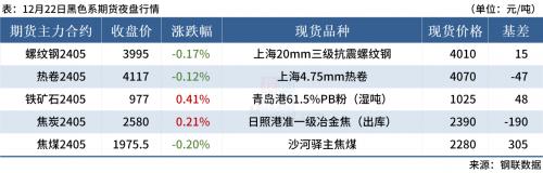 ◎ 12月22日,全国主港铁矿石成交83.50万吨,环比减14.8%;237家主流贸易商建筑钢材成交13.48万吨,环比减1.7%。