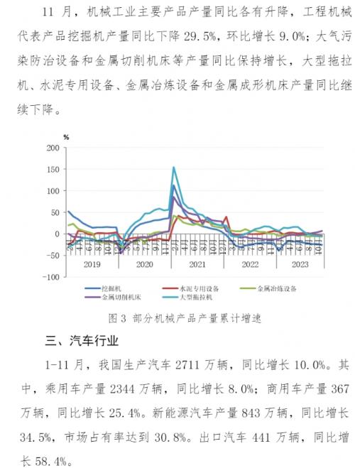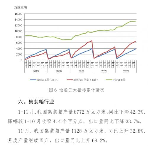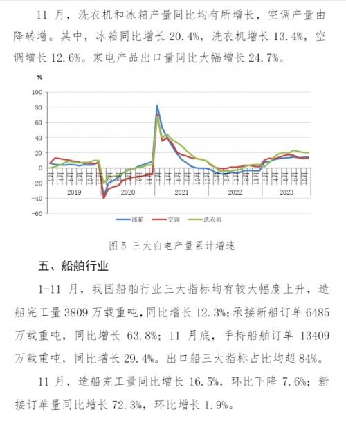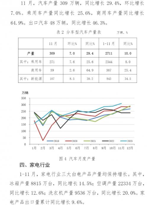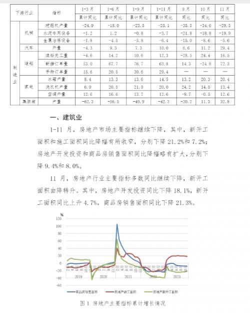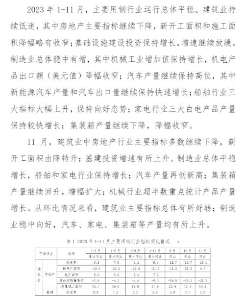2023年1-11月,主要用钢行业运行总体平稳。建筑业持续低迷,其中房地产主要指标继续下降,新开工面积和施工面积降幅略有收窄;基础设施建设投资保持增长,增速继续放缓。制造业总体稳中有增,其中机械工业增加值保持增长,机电产品出口额(美元值)降幅收窄;汽车产量继续保持高位,其中新能源汽车产量和汽车出口量继续保持快速增长;船舶行业三大指标大幅上升,保持向好态势;家电行业三大白电产品产量保持较快增长;集装箱产量继续下降,降幅收窄。