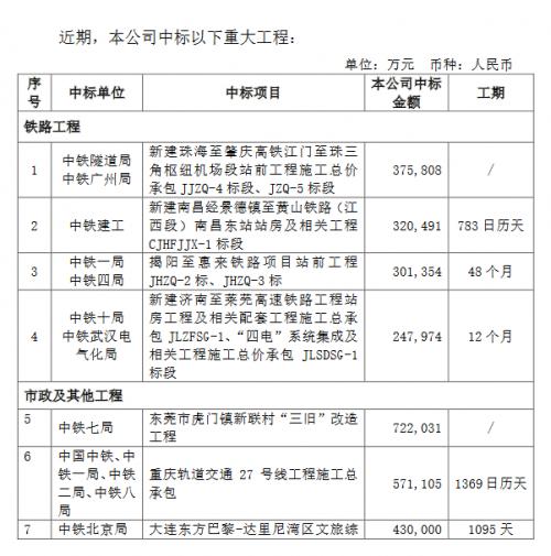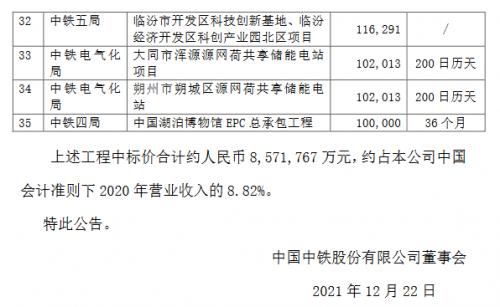 日前,中国中铁发布公告,公司于近期中标多个重大工程,中标价合计约人民币8571767万元,约占本公司中国会计准则下2020年营业收入的8.82%。