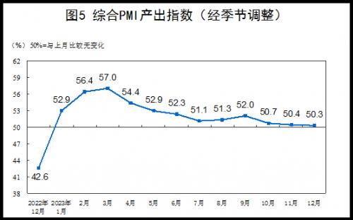 12月份,综合PMI产出指数为50.3%,比上月下降0.1个百分点,高于临界点,表明我国企业生产经营活动总体保持扩张。