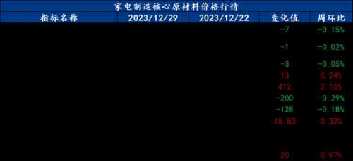 截止2023年12月29日,各原材料当日即时价格以及价格周环比情况如下: