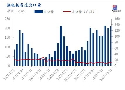 11月热轧板卷出口数量为217.52万吨,环比增5.20%;11月热轧板卷进口为12.82万吨,环比增4.27%。详见图3。就目前来看,11月出口量继续攀升,2023年出口全年强势。