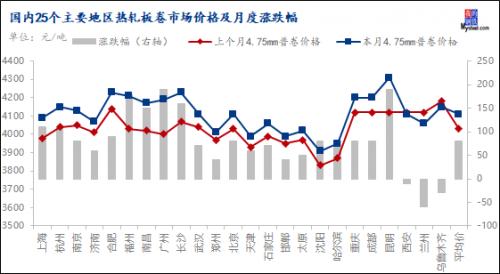 图6:国内25个主要地区热轧板卷市场价格及月度涨跌幅