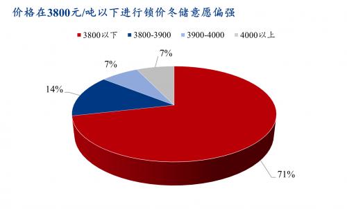 冬储价格方面,从调研的28家贸易商来看,71%贸易商选择在3800以下进行锁价冬储,14%贸易商选择在3800-3900进行锁价冬储,3900-4000以及4000以上进行锁价冬储均为7%。对于贸易商来说若价格居高不下,就会选择被动冬储,也就是说如果建筑钢材价格超过3800元/吨,被动冬储预期则会增强。