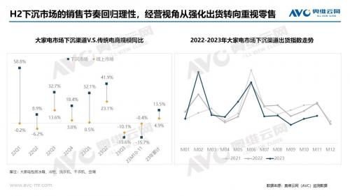 2023年家电行业的渠道碎片化进一步加剧,传统实体和电商不断面临新的挑战。从消费环节上,建材渠道不断吸纳前置消费需求,在购买环节对用户形成截流;在消费形式上,新兴电商逐渐打破单一货架模式,以直播+货架多维度进军家电零售领域;从消费质量上,下沉市场经历了规模扩张期,进入到追求经营质量的新发展阶段。聚焦到下沉渠道来看,相较于2022年的蓬勃发展,2023年呈现发展回归理性、品类同频和价格竞争激烈等特点。