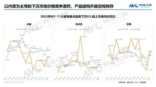 目前下沉渠道中内资企业的参与深度较高,同时用户需求的多元化尚未被完全挖掘,因而在产品的同质化竞争中,价格作为第一手段,率先表现出较大的波动趋势。从23年连续月度来看,相较于线上市场而言,下沉市场的价格大幅波动,尤其进入H2后,冰洗空均表现出一定的价格低迷状态。从23年累计数据来看,下沉市场的价格提升仍有较大空间。未来以用户消费能力提升和品质化需求提升的驱动下,下沉市场的产品结构、价格结构都有进一步的升级空间。