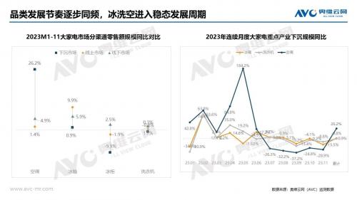 大家电市场分品类来看,基于空调产业高增长的背景,下沉渠道中空调市场涨势突出,冰洗产业相对平稳。奥维云网(AVC)监测数据显示,2023年累计11月,冰箱、洗衣机、空调在下沉市场零售额规模同比分别增长0.9%、下降0.8%和增长26.2%。分节奏看,进入H2后,冰洗空在下沉市场的发展节奏逐步同频。在重视零售的大背景下,大家电产业逐渐进入稳态发展周期。