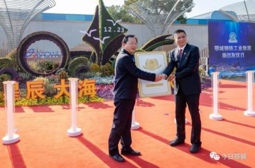 授牌仪式上,鄂州市市委书记孙兵将“国家3A级旅游景区”的牌匾授予鄂城钢铁党委书记、董事长吴琨宗手中。