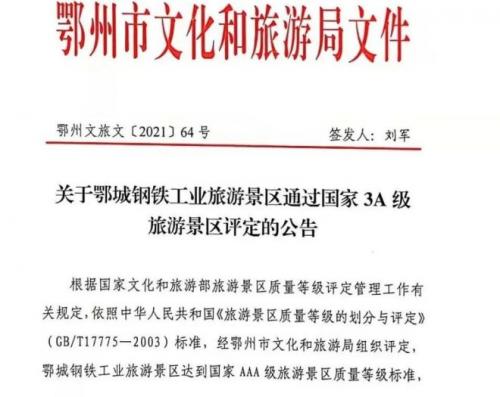 按照《旅游景区质量等级的划分与评定》国家标准和《旅游景区质量等级管理办法》,鄂城钢铁积极推进工业旅游3A级景区达标创评工作,并于2021年12月23日被正式确定为国家3A级旅游景区。