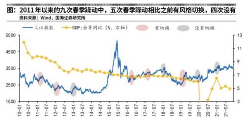 在经济下行压力不断凸显的环境下,近期政策对稳增长有所加力。一方面12月3日国务院总理李克强再次提出“适时降准”,打开了政策进一步宽松的向上空间,另一方面市场对即将召开的中央经济工作会议加力稳增长的预期逐步增强。在此背景下,近期市场风险偏好延续改善态势,赚钱效应有所修复,2022年“春季躁动”提前到“跨年行情”存在较大可能。宏观层面看,2011年与2017年春季躁动行情出现时,国内经济均维持着较强的增长动能,前年末中央经济工作会议提出的政策主基调均转向“稳健”。政策层面来看,两轮春季躁动前国内政策基调均以“稳健”为主。2010年12月中央经济工作会议提出宏观经济政策的基本取向要“积极稳健、审慎灵活”,并强调“把稳定价格总水平放在更加突出的位置”,表明货币政策已明确由“适度宽松”转为“稳健”。2011年一季度,为抑制不断上升的通胀,央行先后进行了五次提准加息,货币政策加速收紧。2016年12月中央经济工作会议提出“稳是主基调,稳是大局”,并增加了“调节好货币闸门”的表述,表明政策基调仍以“稳”为主,货币政策态度偏紧。2011年春季躁动开启前市场处在回调阶段,市场风格无明显分化,进入春季行情之后,周期与成长风格占优,延续牛市主线。在本轮春季行情开始前,面对不断加剧的通胀压力与持续收缩的货币政策,市场进入了回调周期,自2010年11月9日至2011年1月25日,万得全A指数回落15.67%,普跌之下市场风格未出现明显分化。而在市场回调前的上行阶段,受苹果开启智能手机时代以及国内资本开支大幅扩张等景气因素影响,成长与周期风格为牛市主线。在本轮春季行情开始后,周期与成长风格涨幅居前,分别上涨17.45%和17.31%,金融风格表现落后,仅上涨10.34%。从风格切换角度来看,在春季躁动行情前后,市场风格由普跌转为周期、成长占优,但从拉长时间来看,2011年春季躁动行情的风格特征与2010年牛市阶段主线一致。2017年初市场在经历了一个多月的下跌后开始回升,春季行情始于1月中旬,终于3月下旬,市场风格由消费、金融切换至消费、成长。在本轮春季行情开始前,受监管层多次定性谴责A股“举牌”行为的影响,市场风险偏好下行,叠加12月中旬美联储宣布再次加息,A股市场经历了一轮下跌行情。在此期间,市场风格表现为成长风格跌幅最大,金融和消费风格相对抗跌。而在此之前,2016年市场在供给侧改革的影响下,传统周期行业与大消费板块表现占优。在本轮春季行情开始后,消费与成长风格涨幅居前,分别上涨8.34%和8.31%,而金融风格表现落后,仅上涨0.24%。从风格切换角度来看,在春季躁动行情前后,消费风格均有不错表现,而成长与金融风格则是出现了反转,其原因或是在市场对流动性收紧的担忧解除后,成长板块迎来了超跌反弹与估值修复。熊市中的春季躁动:2012年、2019年、2016年2011年,在高通胀的约束下国内政策持续收紧,叠加全球经济走弱的影响,国内经济增速逐季回落。2011年年末,虽然经济增速仍在下滑,但随着通胀压力的缓和,国内货币政策出现明显转向,央行于2011年11月30日和2012年2月8日两次宣布降准,稳增长政策开始发力。2018年,国内经济同处下行趋势,在去杠杆政策和中美贸易摩擦的影响下,基建投资与出口成为了经济的两大拖累项。但与2012年不同的是,由于2018年国内通胀温和,政策的宽松也更早到来。2018年10月15日和2019年1月4日央行两次宣布下调存款准备金1个百分点,在此影响下,2019年初社融与M2增速触底回升,一季度GDP增速与2018年四季度持平,经济呈现企稳态势,整体表现强于2012年。在政策基调方面,中央经济工作会议对政策的定调均指向稳增长。2011年12月中央经济工作会议提出要突出把握好“稳中求进”的政策总基调,意味着政策重心正式由前期的“稳物价”重回“稳增长”。2018年12月中央经济工作会议提出要强化逆周期调节,适时预调微调,稳定总需求,指明稳增长政策将进一步加码发力。整体来看,在2012年、2016年与2019年春季躁动前,政策基调均指向稳增长,政策宽松基调的明确对春季躁动行情形成催化作用。2012年1月初,在美股创下新高、国内货币政策转向宽松以及温家宝总理提出“提振股市信心”的号召等多重利好因素下,A股市场开启了持续时间近两个月的春季躁动行情。在此轮行情开始前,A股经历了近9个月的下跌,自2011年4月中下旬至12月底,万得全A指数下跌28.88%,十年内市盈率分位数由70%降至8%,市场整体位置处于底部。整体来看,在本轮春季躁动行情时期,随着稳增长政策的发力,以及市场对经济预期逐步改善,前期超跌板块迎来估值修复,市场风格出现反转。2015年6月初,牛市行情已演绎至极致配资、降杠杆,本轮牛市迅速终结,市场进入普跌。在2015年下半年至2016年年初,市场共出现三轮深度回调。第一,6月证监会强力清配资引致市场出现断崖式下跌;第二,8月人民币大幅贬值引致第二轮股灾;第三,2016年年初《减持新规》和注册制改革推进对股市流动性带来冲击,熔断机制的实行加剧投资者恐慌心理,引起第三波大幅调整,期间万得全A下跌幅度达到31.82%,各板块跌幅均超过25%,但金融板块展现出相对抗跌性。总的来看,本轮春季躁动是在基本面好转及政策出手救市下迎来的反弹行情,前期回调幅度较大的成长板块迎来超跌反弹。2018年国内经济增速整体下滑,叠加中美贸易战对股市的持