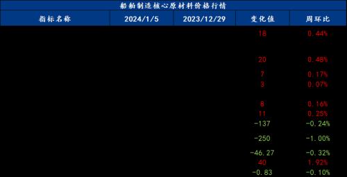 截止2024年1月5日,各原材料当日即时价格以及价格周环比情况如下: