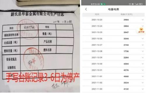 开封市尉氏县华泰金属有限公司生产记录纸质台账显示已停产(左);企业3日实际用电量4132度,显示企业仍在正常生产(右)