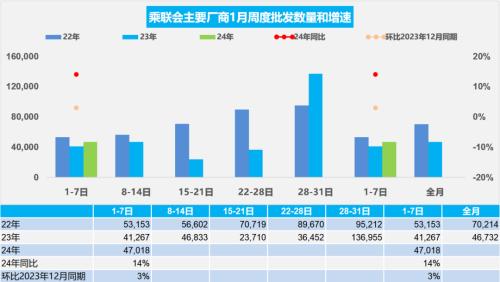 1月第一周批发日均4.7万辆,同比去年1月同期增长14%,环比上月同期增长3%。