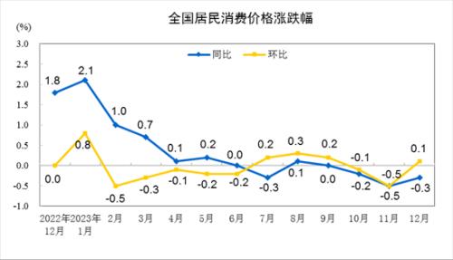 2023年12月份,全国居民消费价格同比下降0.3%。其中,城市下降0.3%,农村下降0.5%;食品价格下降3.7%,非食品价格上涨0.5%;消费品价格下降1.1%,服务价格上涨1.0%。