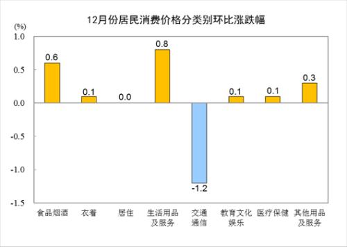 12月份,全国居民消费价格环比上涨0.1%。其中,城市上涨0.1%,农村上涨0.1%;食品价格上涨0.9%,非食品价格下降0.1%;消费品价格上涨0.1%,服务价格上涨0.1%。