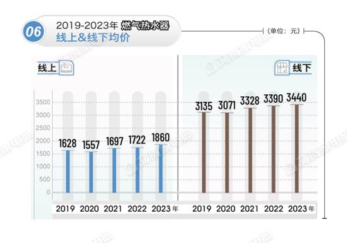 具体到不同的价格段,电热水器线上市场1500元以上销额占比将近45%,同比增长约8个百分点,线下2000元以上销额占比将近70%,跟去年同期相比,增长了3个百分点左右。燃气热水器线上2000元以上产品市场快速增长,销额占比超过60%,同比增长约6个百分点,线下中高端占比较为稳定,4500元以上产品销额占比超过40%,比去年同期微增0.5%。