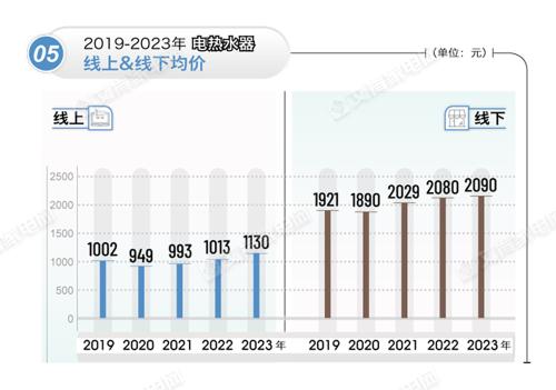 从均价表现来看,无论是电热还是燃热,在线下渠道表现较为平稳,与去年相比仅有小幅变化,但在线上均有明显的同比上涨。具体来看,2023年电热水器产品线上均价为1130元,比去年同期增长117元,线下均价为2090元,比去年同期增长10元,2023年燃气水器产品线上均价为1860元,比去年同期增长138元,线下均价为3440元,比去年同期增长50元。