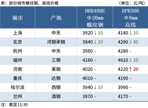 ◎杭州:15日早盘建材市场价格暂稳。螺沙3980,中天3950,西城3930,浙江华宏3880,抗震永钢3980,富鑫3890,江苏镔鑫3890,线材中天4280,亚新4200,联鑫黄海盘螺4100,中新钢铁抗震盘螺4110。(单位:元/吨)
