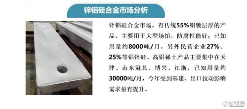 其次,由相关下游市场为出发点,分具体合金产品介绍对合金市场的发展。他提出:“普通合金采购量下降,而锌合金下游对产品个性化的需求和对性价比追求,不断的促进合金市场的发展。”