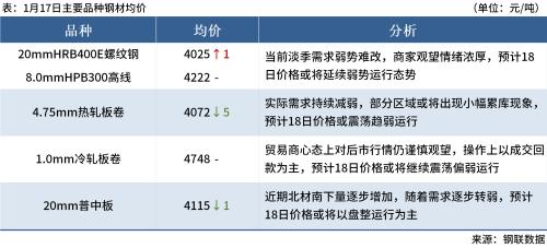 ◎1月17日,全国主港铁矿石成交83.30万吨,环比减23.9%;237家主流贸易商建筑钢材成交9.85万吨,环比减8.9%。