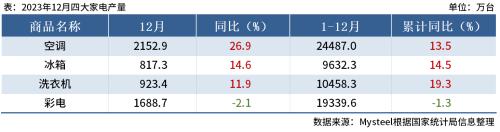 国家统计局数据显示,2023年12月中国空调产量2152.9万台,同比增长26.9%;1-12月累计产量24487万台,同比增长13.5%。
