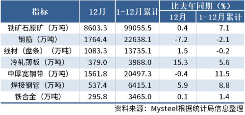 12月份,中国铁矿石原矿产量为8603.3万吨,同比增长0.4%;1-12月累计产量为99055.5万吨,同比增长7.1%。