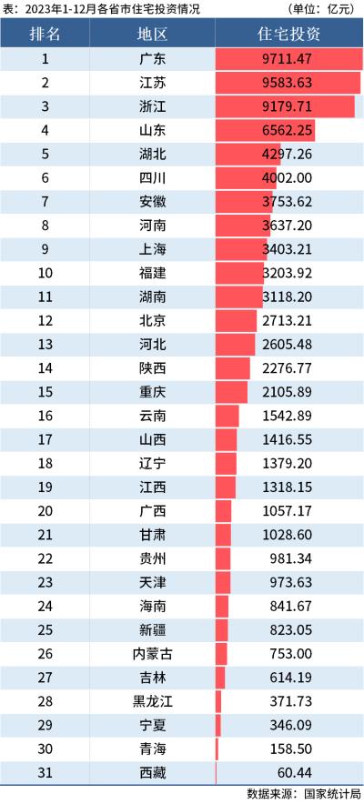 从住宅投资情况来看,广东、江苏和浙江排名前三,且投资额均超9000亿。西藏住宅投资额最少,仅为60.44亿元。