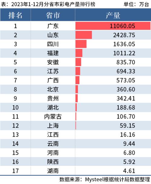 从分省市数据来看,2023年1-12月广东以产量11060.05万台排名第一;山东以产量2428.75万台排名第二;四川产量1636.05万台排名第三。