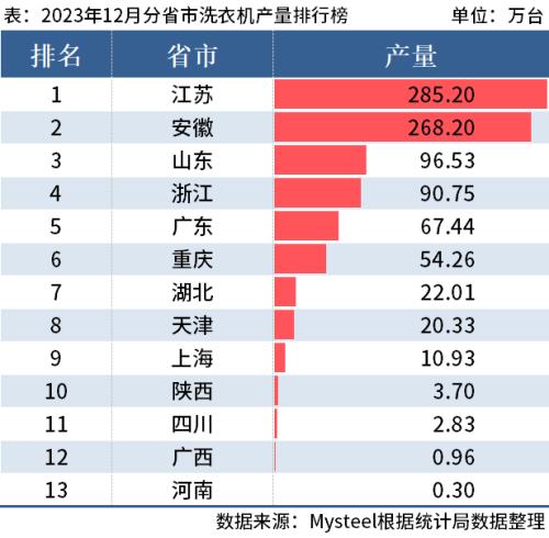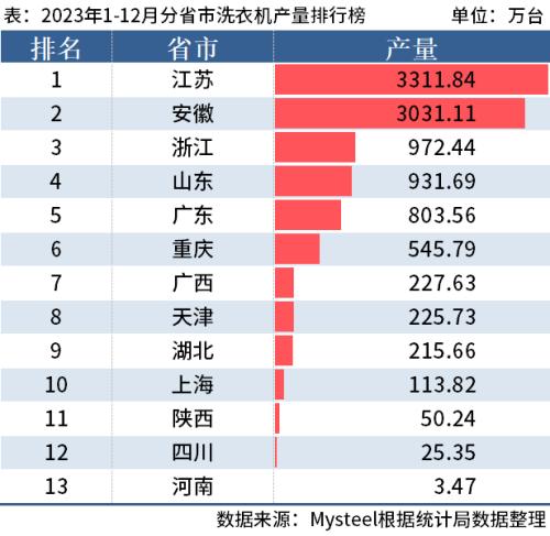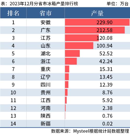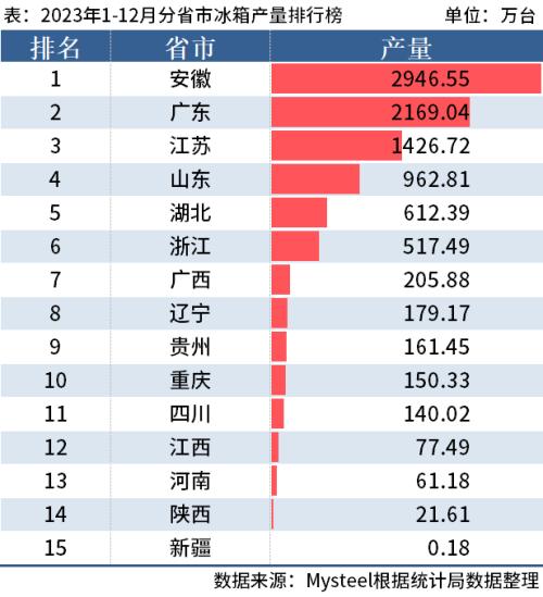 从分省市数据来看,2023年1-12月安徽产量2946.55万台排名第一;广东产量2169.04万台排名第二;江苏产量1426.72万台排名第三。