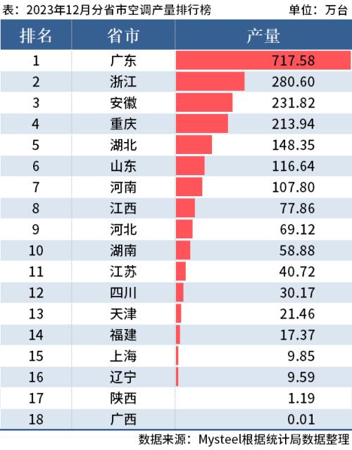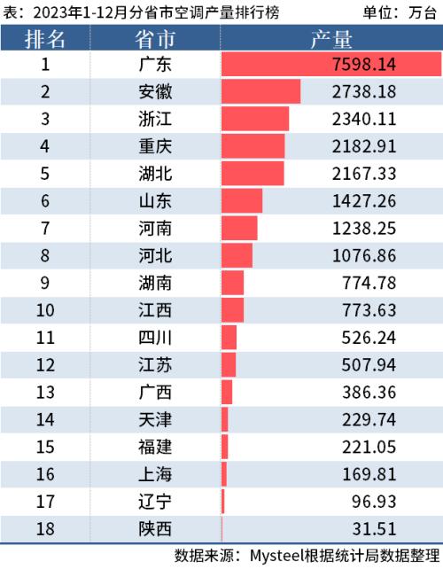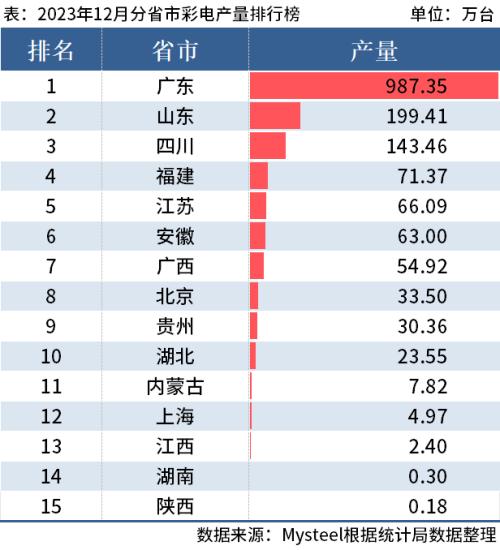 从分省市数据来看,2023年1-12月广东以产量7598.14万台位列第一;安徽产量2738.18万台排在第二;浙江产量2340.11万台排在第三。