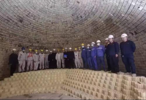 图为韶钢8号3200m3容积高炉4号热风炉大修结束后,韶钢和豫兴公司的参修工作人员在点火前的该热风炉炉内合影。
